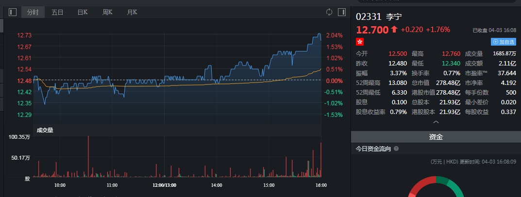 截至今日收盘,李宁(02331)涨1.76%,报12.70港元。