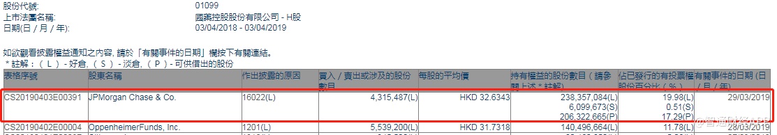 智通财经APP获悉,根据联交所资料显示,摩根大通于3月29日减持国药控股(01099)432万股,每股作价32.63港元,总值约1.41亿港元,最新持股数目约2.38亿股,最新持股比例减至19.98%。