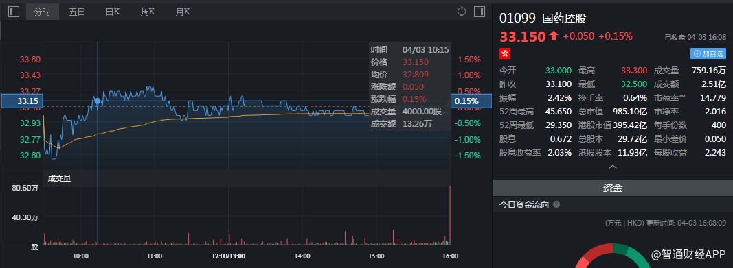 截至今日收盘,国药控股(01099)涨0.15%,报33.15港元。