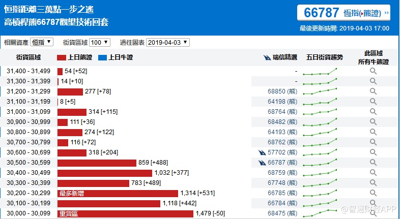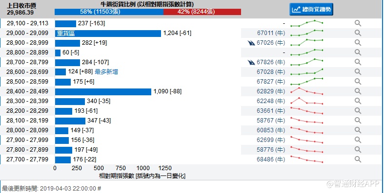 智通财经APP获悉,截至4月3日,恒指最新的牛熊街货比例58:42。从瑞信恒指牛熊证街货分布图中得到的数据显示,熊证街货重货区在30000-30099区间,该区间最新熊证数量为1479张,较上一交易日减少50张;最多新增区间在30200-30299。牛证街货重货区在29000-29099区间,该区间最新牛证数量为1204张,比上一交易日减少61张;最多新增区间在28600-28699。