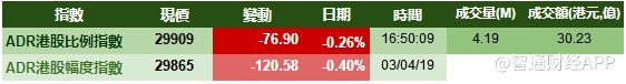 智通财经APP获悉,港股ADR指数全日微跌,按比例计算,收报29909点,跌76.9点。汇丰控股收报66.8元,较港收市升0.4元;腾讯控股收报376.77元,较港收市跌1.23元。