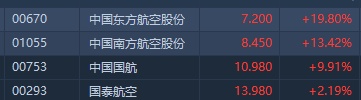 智通财经APP获悉,航空股今日集体大幅高开,截至9时20分,东航(00670)涨19.8%,南航(01055)涨13.42%,中国国航(00753)涨9.91%。