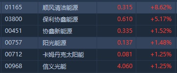 智通财经APP获悉,光伏板块今日逆市走升,截至发稿,顺风清洁能源(01165)涨8.62%,保利协鑫能源(03800)涨5.17%,协鑫新能源(00451)涨1.52%,阳光能源(00757)涨1.48%。
