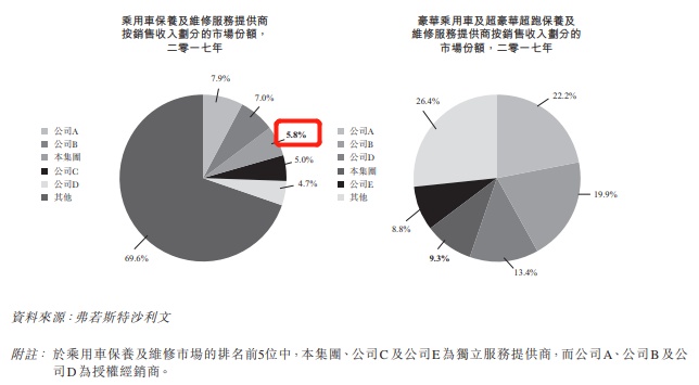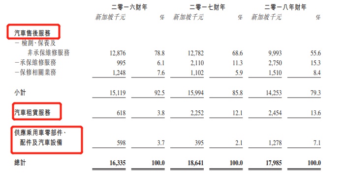 该公司业务大致可分为提供汽车售后服务、租赁服务、提供乘用车零部件、配件及汽车设备。该公司主要从事提供全面的汽车售后服务,专注于检测、保养及维修服务。该公司亦从事提供短期及长期汽车租赁服务及向新加坡与斯里兰卡及缅甸等海外国家客户提供乘用车零部件、配件及汽车设备。