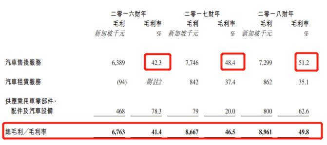 该公司的毛利率由2016年的41.4%增至2017年的46.5%,进一步增至2018年的49.8%,主因汽车售后服务的毛利率增加及乘用车零部件、配件及汽车设备的毛利率增加。