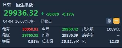 智通财经APP获悉,恒指早盘低开35.97点或0.12%,报29950.42点。截至收盘,恒生指数跌50.07点或0.17%,报29936.32点,全日成交额达1089.92亿。国企指数跌0.11%,报11692.37点,红筹指数跌0.28%,报4728.88点。