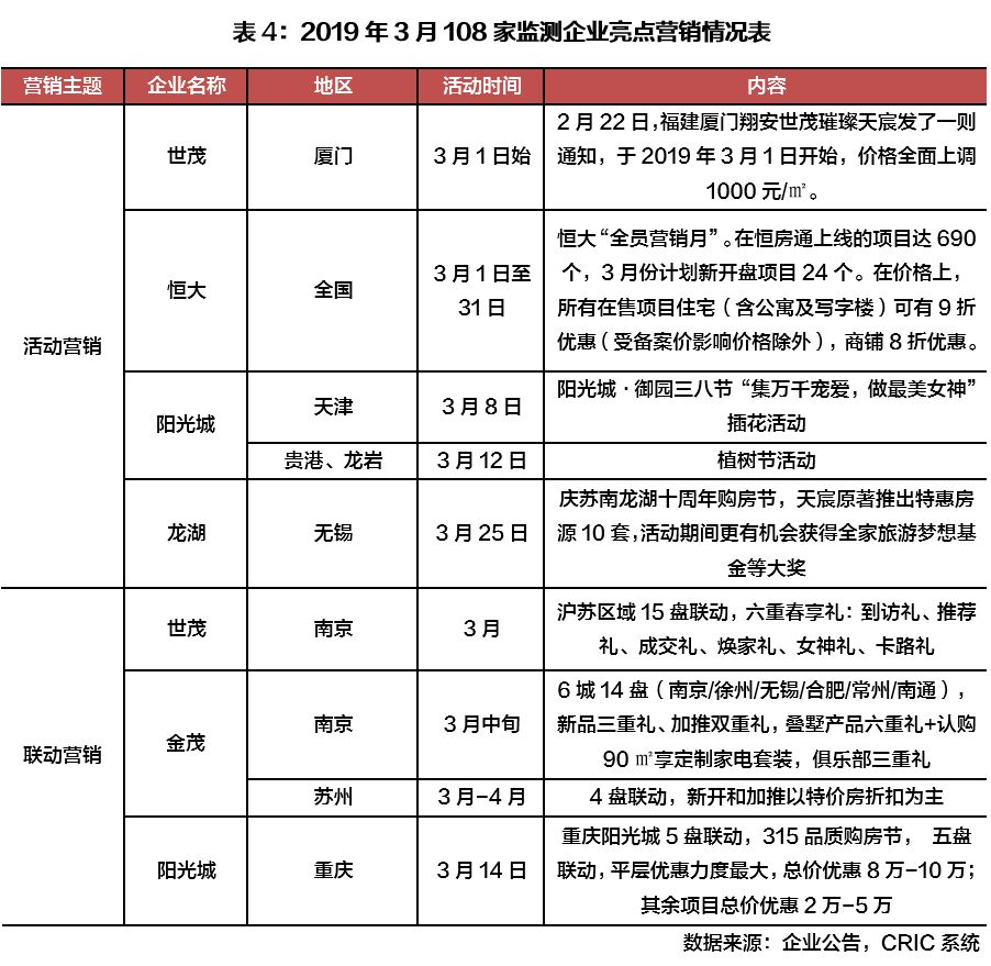 本月房企的区域营销或多城联动的营销动作总体较少,而金茂、世茂、中海、阳光城等企业选择南京、苏州、重庆等地进行多城多盘联动或大型品牌营销活动;金茂南京区域的6城联动营销,从1月新春置业计划延续到3月“春雷行动”,最多有14个盘参加,营销活动具有连续性。苏州的4盘联动营销则是以特价房折扣带动新盘销售和老盘去化。企业的大规模活动也是一种市场回暖的信号,抓住窗口期抢占市场。