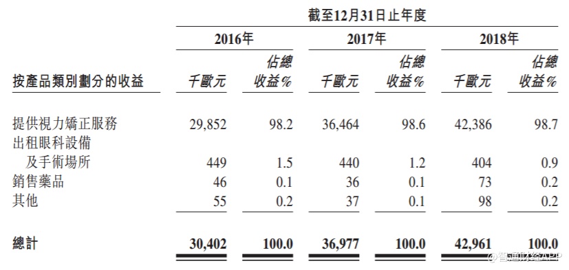 目前,视力矫正服务为公司核心业务及最主要的收入来源。招股书显示,2016-2018年,公司总收益从3040.2万欧元增至4296.1万欧元。期间视力矫正业务的收入占比始终保持在98%以上。