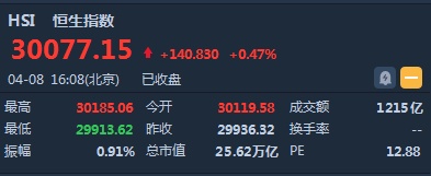 智通财经APP获悉,恒指早盘高开183.26点或0.61%,报30119.58点。截至收盘,恒生指数涨140.83点或0.47%,报30077.15点,全日成交额达1215.14亿。国企指数涨0.87%,报11793.65点,红筹指数涨0.17%,报4737.07点。