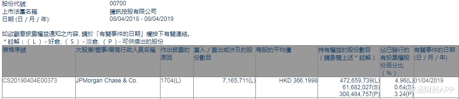 智通财经APP获悉,根据联交所资料显示,摩根大通于4月1日减持腾讯控股(00700)716万股,每股作价366港元,总值约26.2亿港元,最新持股数目约4.72亿股,最新持股比例减至4.96%。
