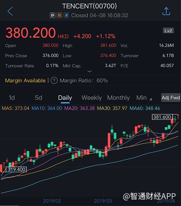 截至今日收盘,腾讯控股(00700)涨1.12%,报380.2港元。