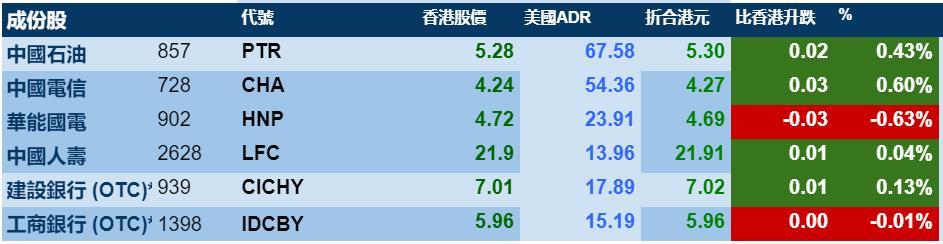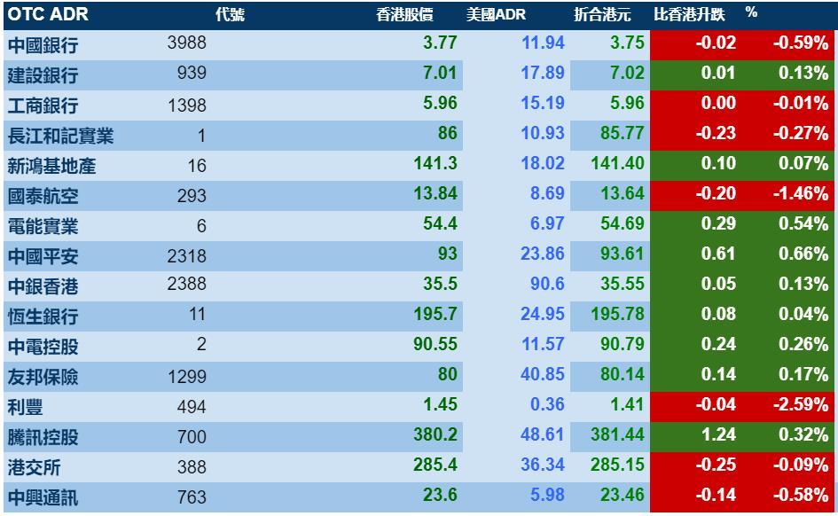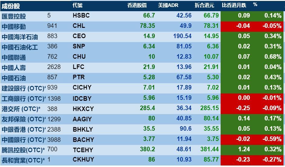 智通财经APP获悉,尽管周一美股涨跌不一,但港股ADR指数仍旧走高,按比例计算,收报30108点,较港收市升30.92点或0.10%。汇丰控股收报66.79元,较港收市升0.09元;腾讯控股收报381.44元,较港收市升1.元。