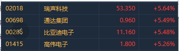 智通财经APP获悉,苹果概念股今日集体走强,截至发稿,瑞声科技(02018)涨5.64%,通达集团(00698)涨5.49%,比亚迪电子(00285)涨5.48%,高伟电子(01415)涨5.26%。