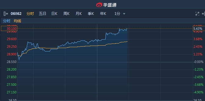 智通财经APP获悉,海底捞(06862)股价持续走高,盘中高见30.1港元,再创上市新高,截至13时56分,涨5.43%,报价30.1港元,成交额1.147亿。