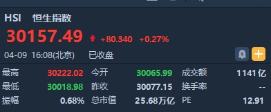 智通财经APP获悉,恒指早盘低开0.04%,横盘整固后逐步拉升,高见30222.02点再度刷新近10个月新高,随后维持窄幅震荡,尾市企稳于30100关口上方。截至收盘,恒生指数涨80.34点或0.27%,报30157.49点,全日成交额达1141.88亿。国企指数涨0.18%,报11815.00点,红筹指数涨0.63%,报4767.08点。