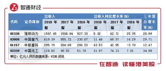 截至目前,四家企业2018年报均已披露。销售规模方面的增长,重卡的潍柴动力和中国重汽,2018年营收增速仅为5.22%和11.46%,三年复合增长率为28.99%、29.71%;同属工程机械的中联重科和中国龙工,2018年营收有43.53%和31.97%的增速,过去三年的复合增长率为12.47%、34.98%。