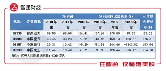 利润方面,重卡的潍柴动力和中国重汽,2018年净利润增速为27.16%和43.72%,大幅低于16、17年的同比增速,三年复合增长率为83.02%、176.31%;同属工程机械的中联重科和中国龙工,2018年净利润增速为51.34%和9.39%的增速,同样大幅低于16、17年,过去三年的复合增长率为183.64%、114.1%。