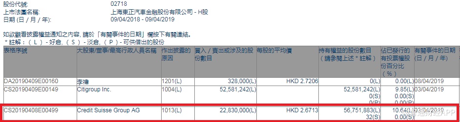 智通财经APP获悉,根据联交所资料显示,瑞信集团于4月3日增持东正金融(02718)2283万股,每股作价2.67港元,总值约6095万港元,最新持股数目5675万股,最新持股比例增至10.64%。