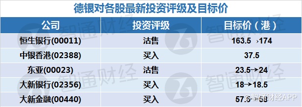 德银分别给予中银香港、大新银行以及大新金融(00440)“买入”评级,但是给予恒生银行和东亚(00023)“沽售”评级。