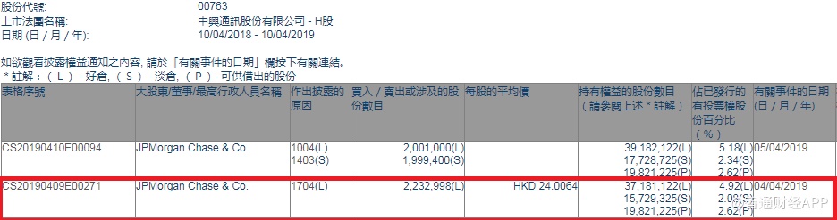 智通财经APP获悉,根据联交所资料显示,摩根大通于4月4日减持中兴通讯(00763)223万股,每股作价24港元,总值约5352万港元,最新持股数目3718万股,最新持股比例减至4.92%。