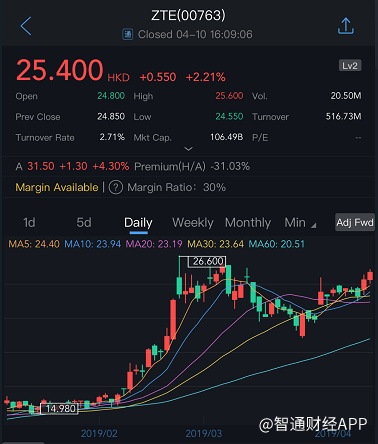 截至今日收盘,中兴通讯(00763)涨2.21%,报25.4港元。