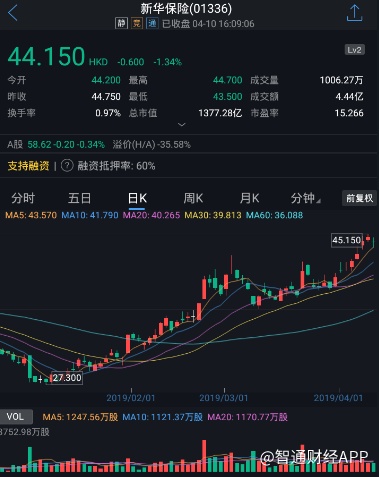 截至今日收盘,新华保险跌1.34%,报44.15港元。