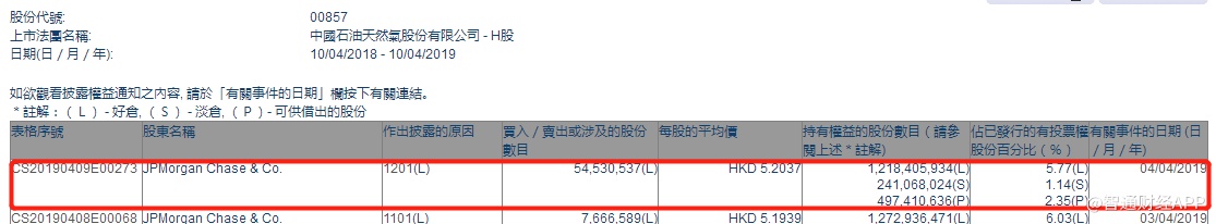 智通财经APP获悉,根据联交所资料显示,摩根大通于4月4日减持中国石油股份(00857)5453万股,每股作价5.20港元,总值约2.84亿港元,最新持股数目约12.18亿股,最新持股比例减至5.77%。