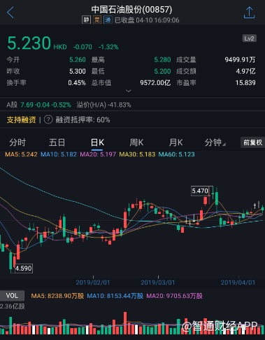 截至今日收盘,中国石油股份(00857)跌1.32%,报5.23港元。