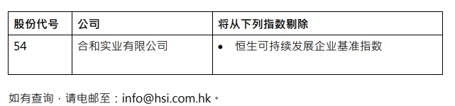 智通财经APP获悉,4月10日,恒生公司公布,若Petrus HK Corporation Limited 提出的私有化建议条件达成或获豁免,合和实业有限公司(00054)将从香港联合交易所退市。届时,合和实业将于2019 年4 月17 日(星期三) 收市后以当天收市价从恒生可持续发展企业基准指数中剔除。该变动将于2019 年4 月18 日(星期四) 起生效。