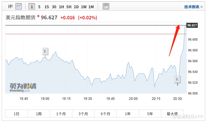 数据公布后,美元指数短线上扬,截至发稿,涨0.02%,报96.627。