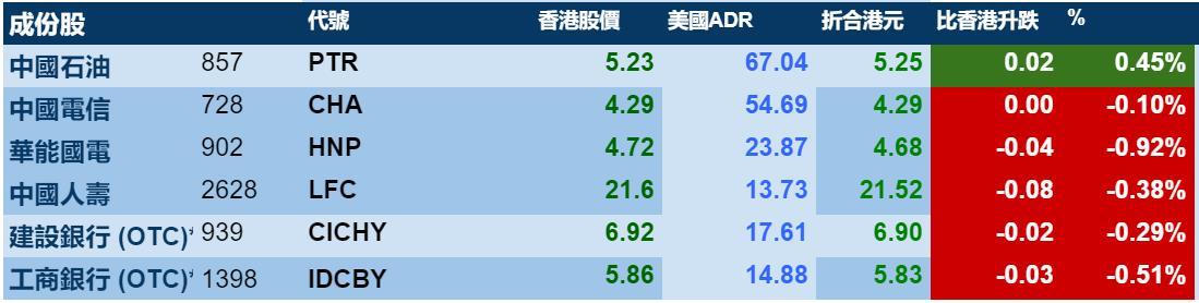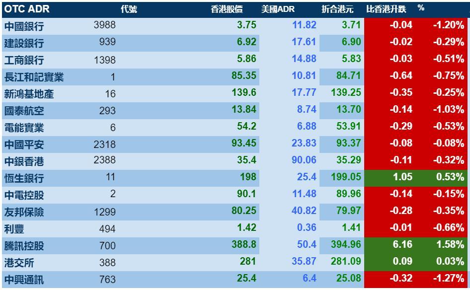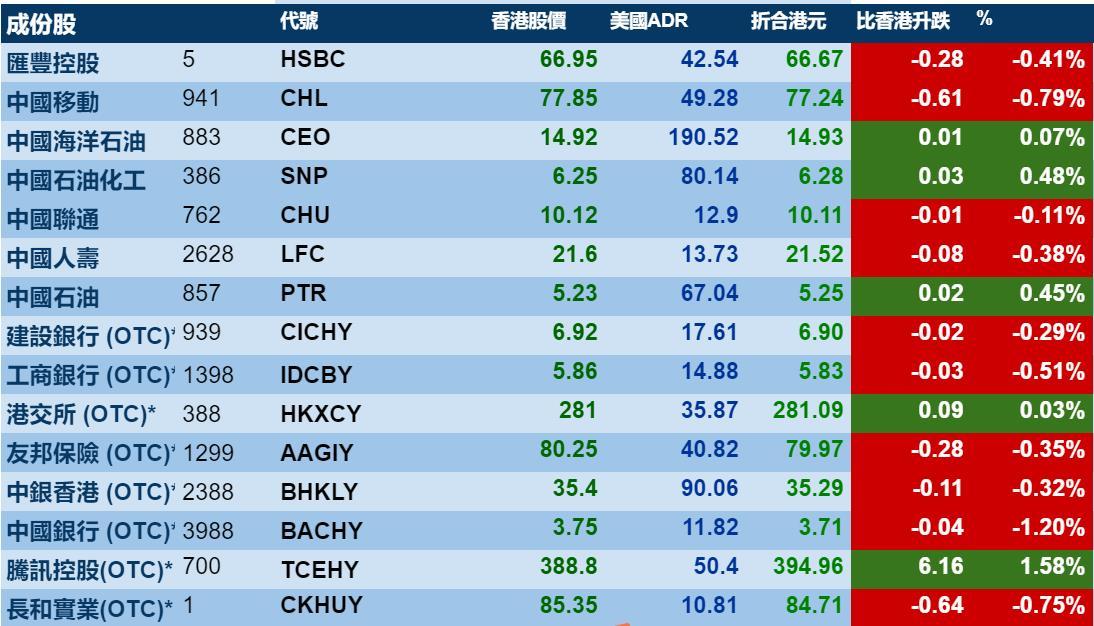 智通财经APP获悉,周三美股收涨,但港股ADR指数没有协同走强,按比例计算,收报30119点,较港收市涨0.41点或0.00%。大型蓝筹涨跌不一,汇丰控股收报66.67元,较港收市跌0.28元;腾讯控股收报394.96元,较港收市涨6.16元。