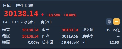 智通财经APP获悉,恒生指数开盘涨0.06%,报30138.14点。国企指数跌0.05%,报11758.67点。红筹指数涨0.09%,报4749.21点。大市盘前成交35.35亿港元。美联储纪要重申年内不加息,隔夜美股小幅收涨。