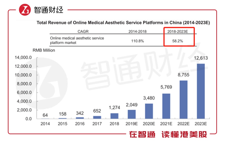 因此,近年来的线上医美平台凭借自身的优势快速崛起。从2018-2023年,线上医美市场预计的年复合增长率为58.2%,远快于整体医美市场的增长速度。