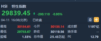 截至收盘,恒生指数跌280.11点或0.93%,报29839.45点,全日成交额达1197.76亿。国企指数跌1.24%,报11618.04点,红筹指数跌1.56%,报4671.01点。