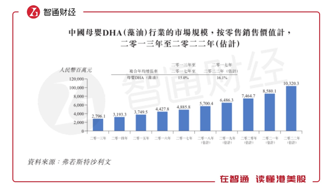 从行业前景来看,据弗若斯特沙利文数据,预计2022年中国母婴DHA(藻油)行业的市场规模将达到103.2亿元人民币。其中,2017-2022年间的复合年均增长率为16.1%。
