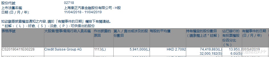 智通财经APP获悉,根据联交所资料显示,瑞信集团于4月8日增持东正金融(02718)594万股,每股作价2.7港元,总值约1603万港元,最新持股数目7441万股,最新持股比例增至13.95%。