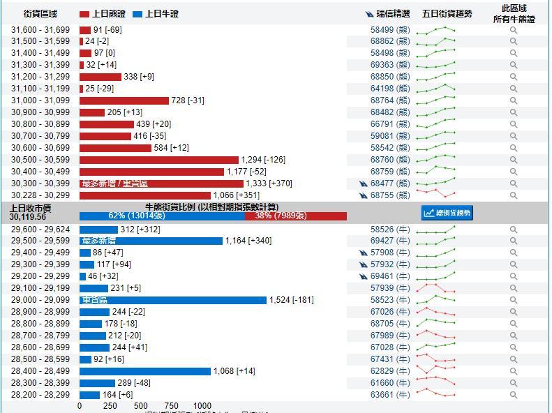 智通财经APP获悉,截至4月11日,恒指最新的牛熊街货比例62:38。从瑞信恒指牛熊证街货分布图中得到的数据显示,熊证街货重货区在30300-30399区间,该区间最新熊证数量为1333张,较上一交易日增加370张;最多新增区间在同一区间。牛证街货重货区在29000-29099区间,该区间最新牛证数量为1524张,比上一交易日减少181张;最多新增区间在29500-29599区间,新增340张。