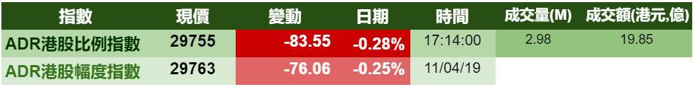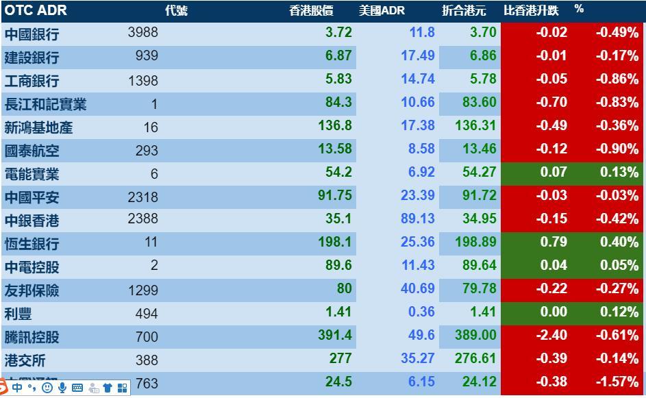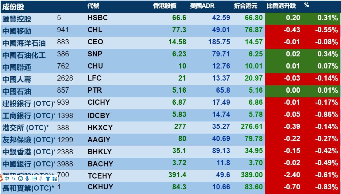 智通财经APP获悉,周四美股近乎平收,港股ADR指数势必走弱,按比例计算,收报29755点,较港收市跌83.55点或0.28%。大型蓝筹涨跌不一,汇丰控股收报66.80元,较港收市跌0.20元;腾讯控股收报389元,较港收市跌2.4元。