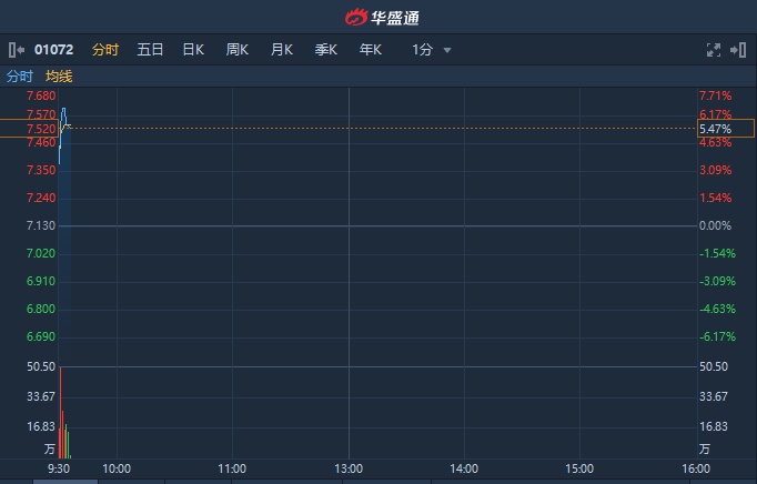 智通财经APP获悉,东方电气(01072)A股早盘一字板,延续三连板,H股亦跟随大涨,截至9时35分,涨5.47%,报7.52港元,成交额达1166万港元,三日升幅近20%.