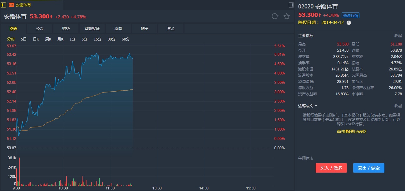 大摩估计,安踏体育2019年至2021年每股盈利预测分别为1.89、2.29及2.69元人民币,2019年纯利可按年升31%至53.55亿人民币,公司2020年纯利可按年升21%至64.79亿人民币。