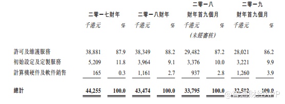 于往绩记录期间,公司的收益产生于:1、许可及维护服务;2、初始设定及定制服务;3、计算机硬件及软件销售。其中许可及维护服务是公司的主要收益来源,2017财年、2018财年及2019财年首九个月的收益占比分别为87.9%、88.2%及86.2%。