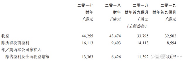 招股书显示,公司2017财年、2018财年及2019财年首九个月收益分别为4425.5万港元、4347.4万港元及3250.2万港元;净利分别为1336.3万港元、642.6万港元及661.5万港元。