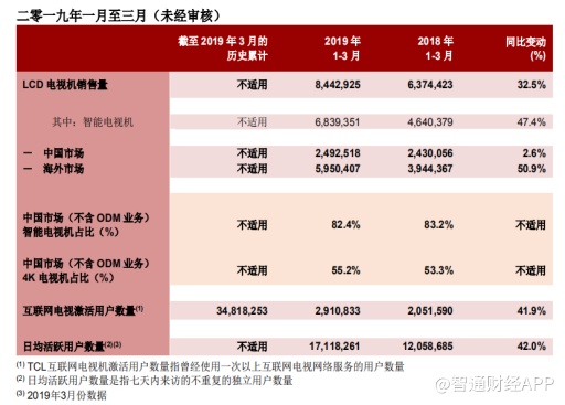 受益于积极的全球化布局、产品力和品牌力持续提升、产品结构和渠道结构进一步优化,TCL电子2019年第一季度LCD电视机整体销售量维持高速增长,其中智能电视机和4K电视机销售量分别为683.9万台及332.3万台,分别实现47.4%及82.8%的明显增长。