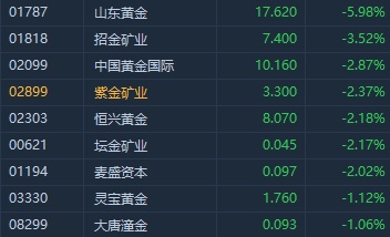 智通财经APP获悉,黄金股今日集体走低,截至发稿,山东黄金(01787)跌5.98%,中国黄金国际(02099)跌2.87%,紫金矿业(02899)跌2.37%,恒兴黄金(02303)跌2.18%。