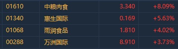 智通财经APP获悉,猪肉股今日集体逆市走升,截至发稿,中粮肉食(01610)涨8.09%,惠生国际(01340)涨5.63%,雨润食品(01068)涨4.02%,万洲国际(00288)涨3.73%。