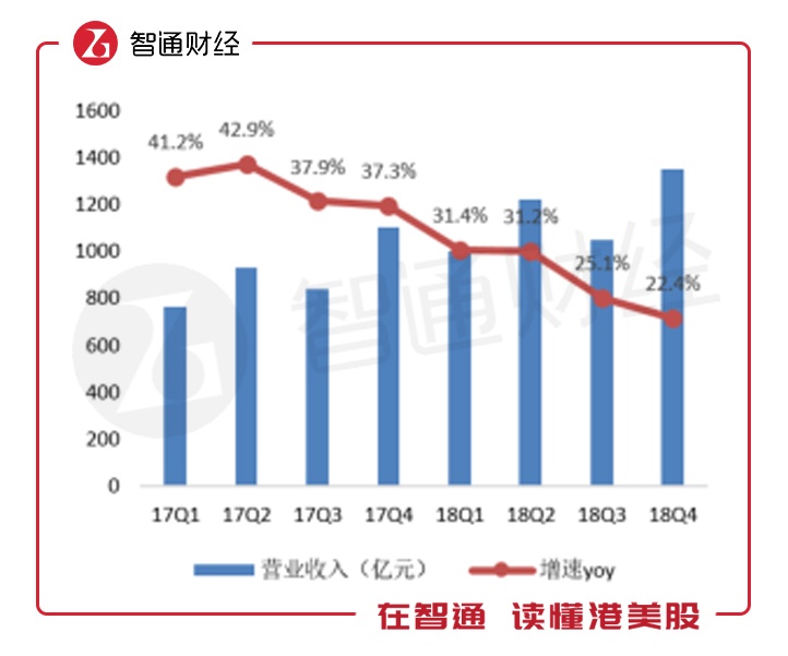 目前京东营收端仍在增长,但增速持续放缓。数据显示,2018第四季度京东净收入为1348亿人民币(单位下同),同比增长22.4%,高于市场预期1.8%。但低于苏宁同期29.1%的营收增速,而且从2017年2季度开始,营收增速一路下滑,目前已下滑近20个百分点。