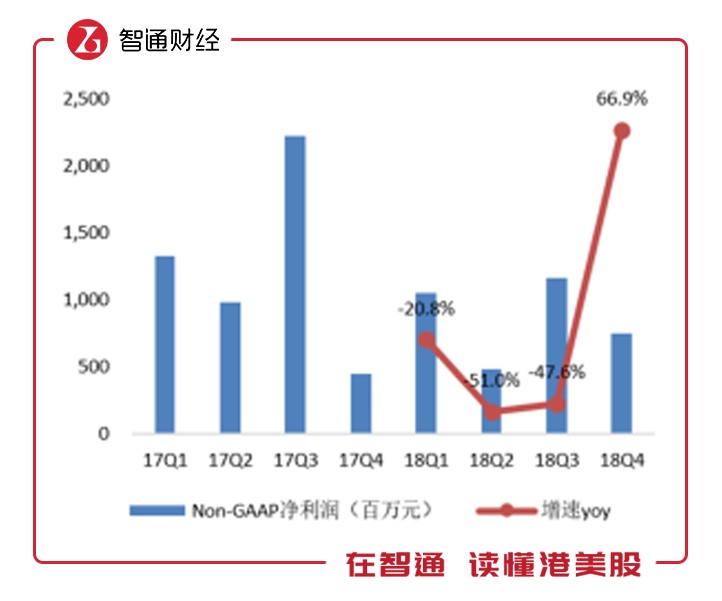 利润端,2018年四季度出现了唯一的回升。2018年,公司在前三季度Non-GAAP净利润,分别同比下滑20.8%、51%、47.6%之后,终于第四季度同比增长67%至7.499亿元;净利率为0.6%,较去年同期增长0.2百分点,高于市场亏损预期。