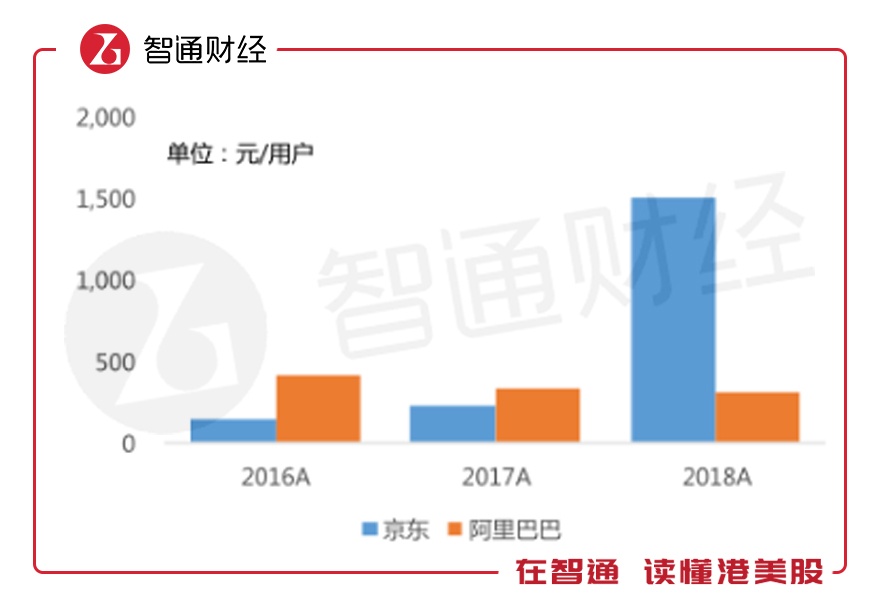 而且从获客效率指标来看,京东2018年单用户获客成本达1500元,同比增长超过500%,而同期阿里巴巴的单用户获客成本仅为300元左右,京东的获客效率较阿里已有明显差距。