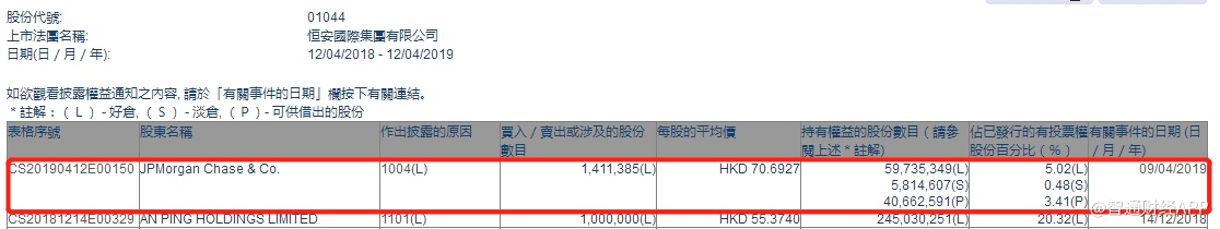 智通财经APP获悉,根据联交所资料显示,摩根大通于4月9日增持恒安国际(01044)141万股,每股作价70.69港元,总值9967.29万港元,最新持股数目5973万股,最新持股比例为5.02%。