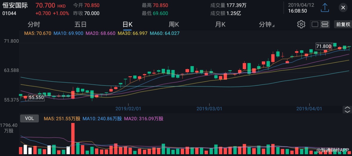 截至今日收盘,恒安国际(01044)收涨1.0%,报70.70港元。